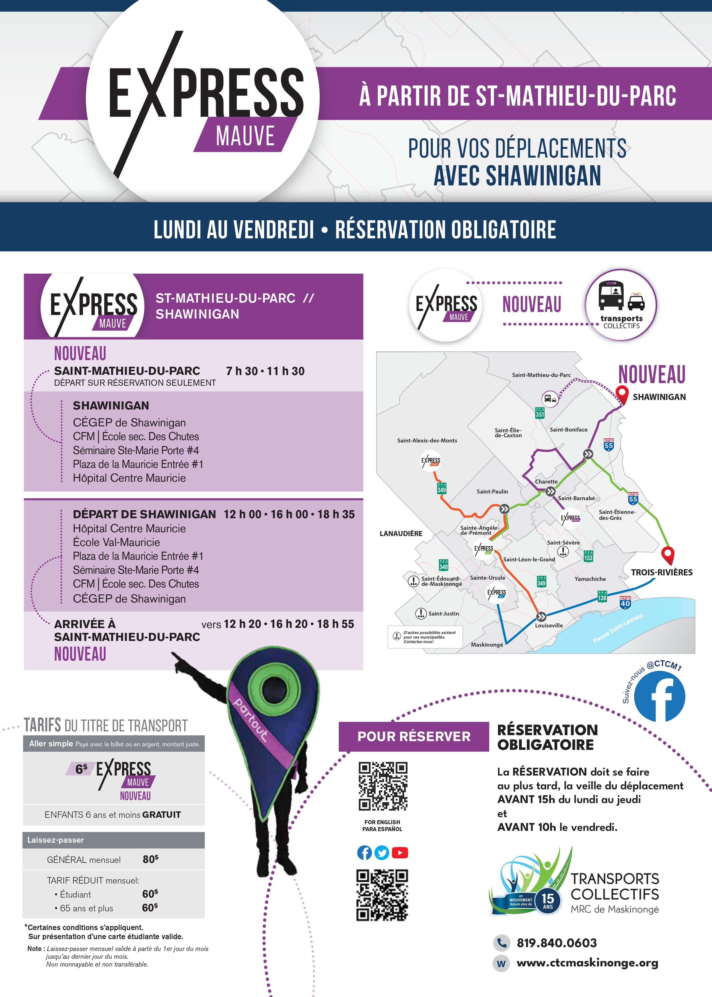 - L'EXPRESS MAUVE : St-Barnabé, Charette, St-Élie-de-Caxton, St-Boniface, St-Mathieu-du-Parc et Shawinigan - RÉSERVATION OBLIGATOIRE.