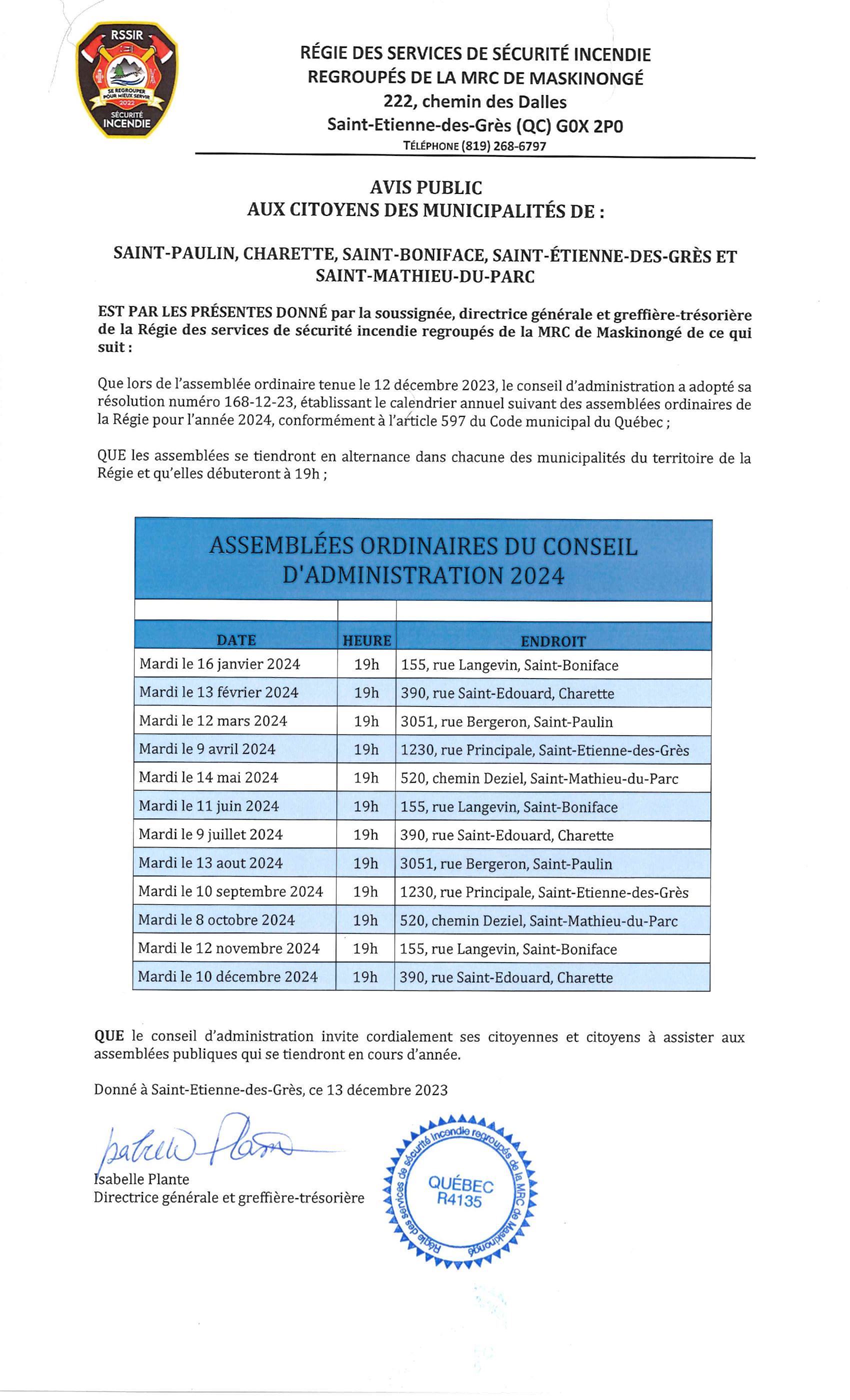 Assemblée ordinaire - Régie des services de sécurité incendie regroupés de la MRC de Maskinongé
