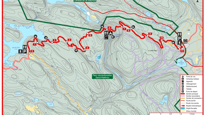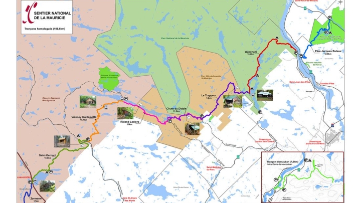 Plusieurs tronçons sont liés en Mauricie, dont un dans le Parc Récréo: le tronçon de la Chute du Diable, sur lequel est situé un appenti et une plateforme pour une tente avec toilette sèche.